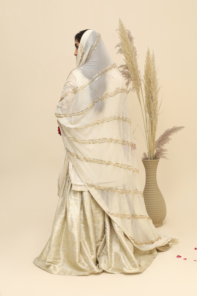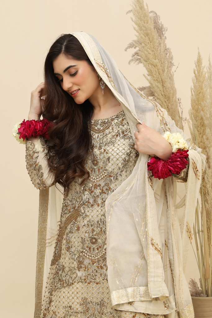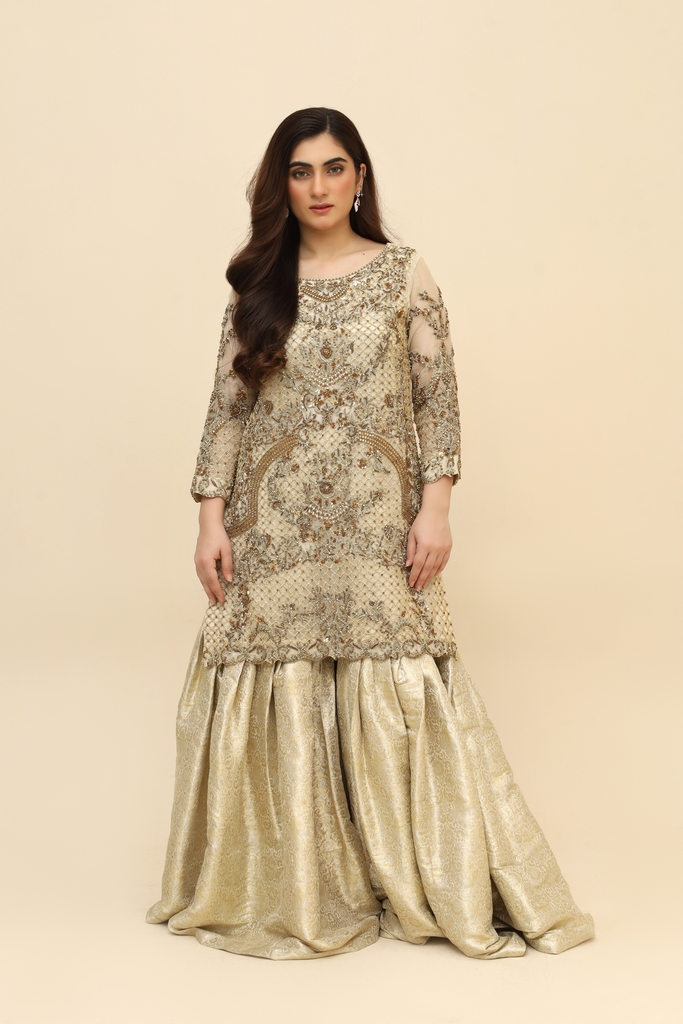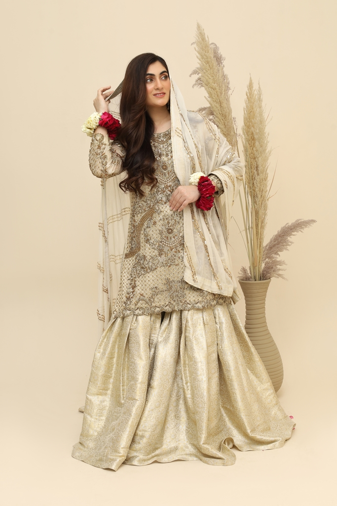 The ensemble is paired with a rich kimkhwab gharara that adds depth and grandeur to the silhouette, while the dull crinkle dupatta completes the look with subtle texture and sophistication.