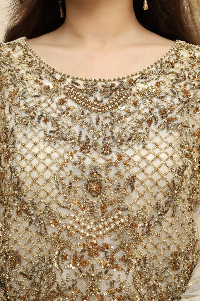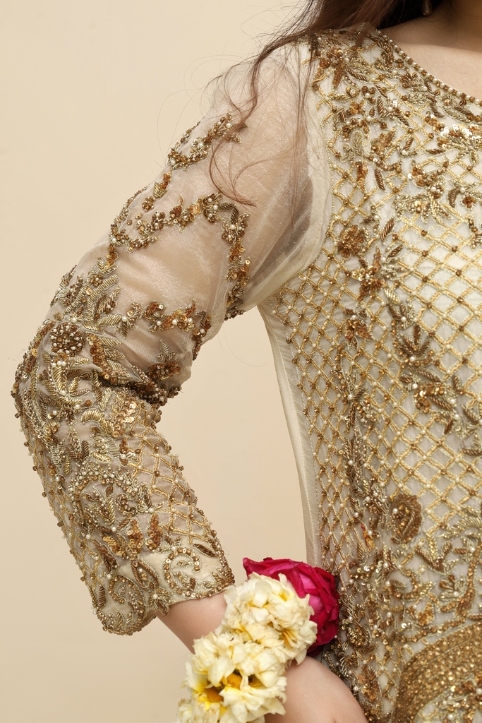 Ismara Royale is a timeless expression of classic eastern luxury. Crafted from pure zari chiffon, the shirt is exquisitely adorned with intricate heavy gold zardozi work spread gracefully across the shirt and sleeves, reflecting traditional craftsmanship and regal elegance.
