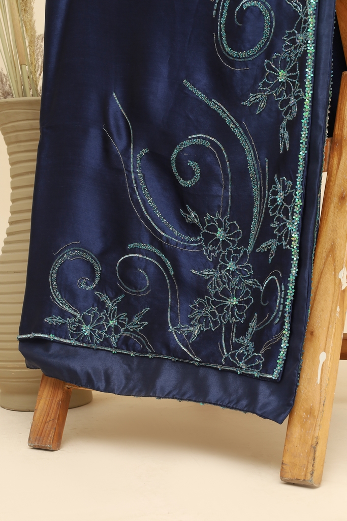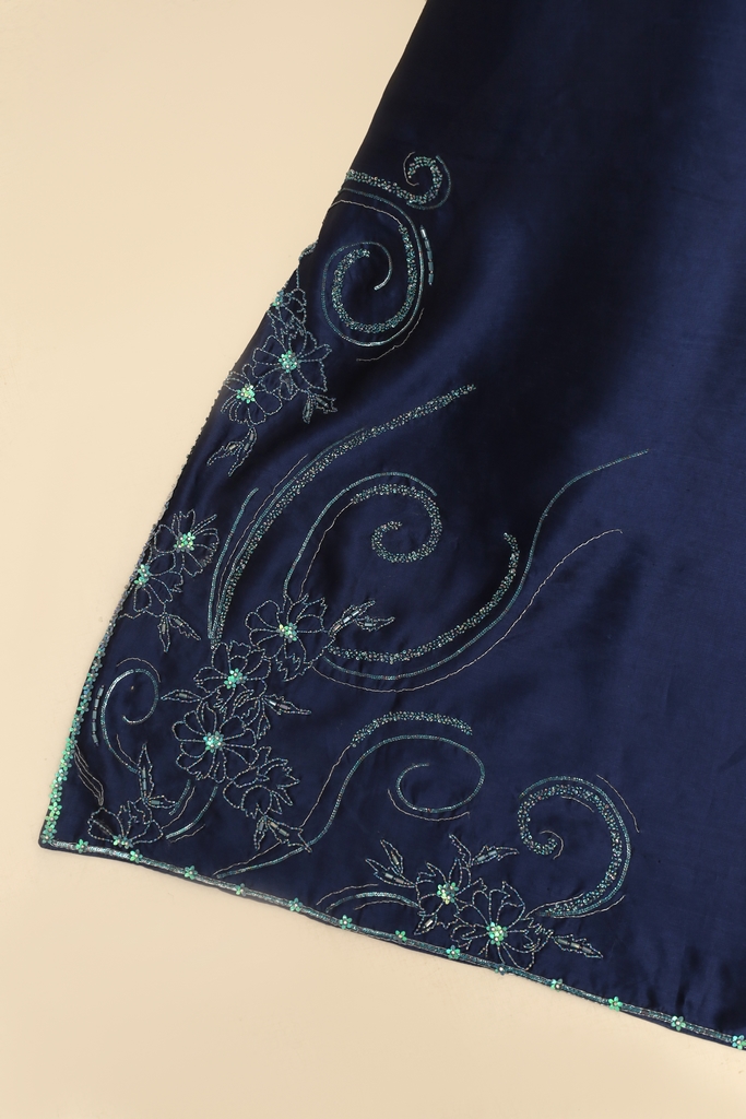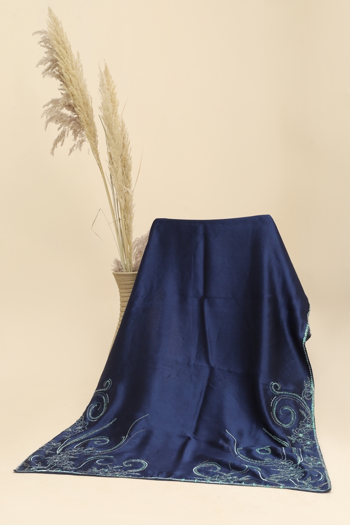 Experience the pinnacle of craftsmanship with Noctis Éclat, a navy blue pure tissue silk shawl designed for discerning connoisseurs of luxury. Intricate motifs are hand-embellished using zero-size sequins, cutdana, moti, and dabki tinkle, creating a shimmering effect that captures light beautifully.