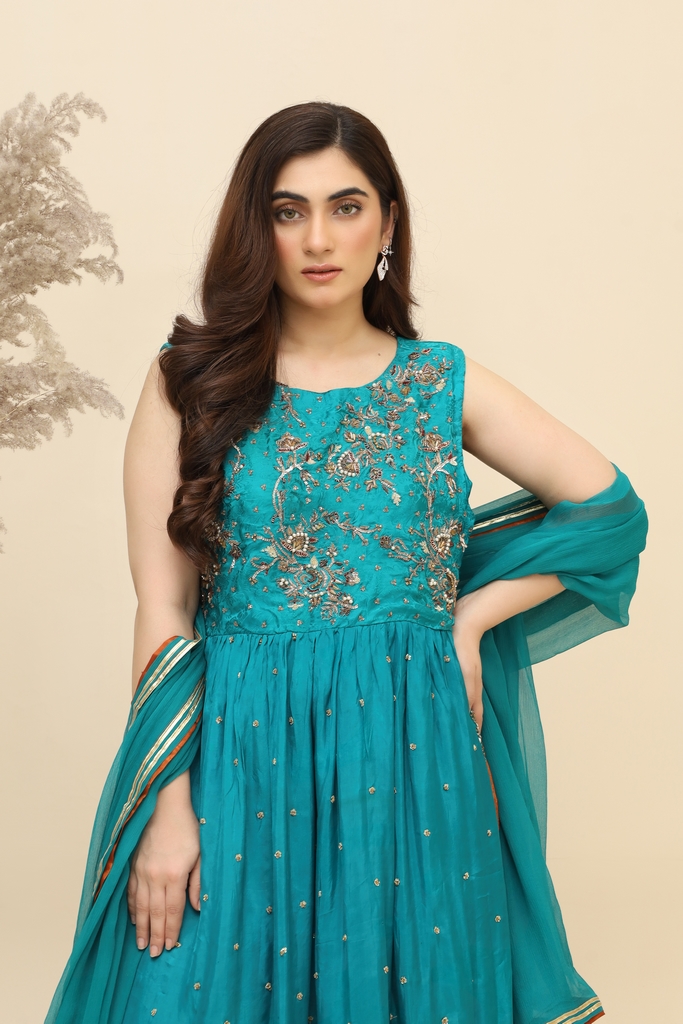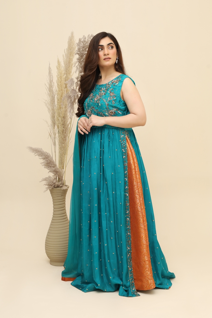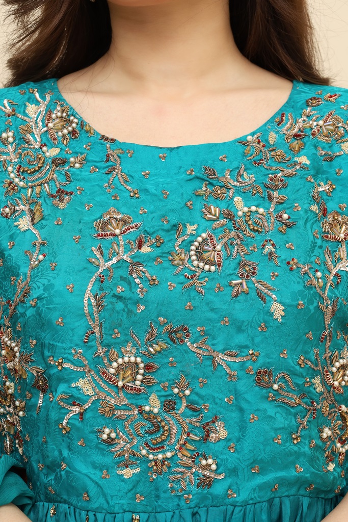 An exquisite long ensemble designed to make a statement through subtle elegance. Rendered in premium pure self silk, the outfit features a meticulously embellished bodice, complemented by a soft spray of embellishments across the shirt and intricately finished slit borders.